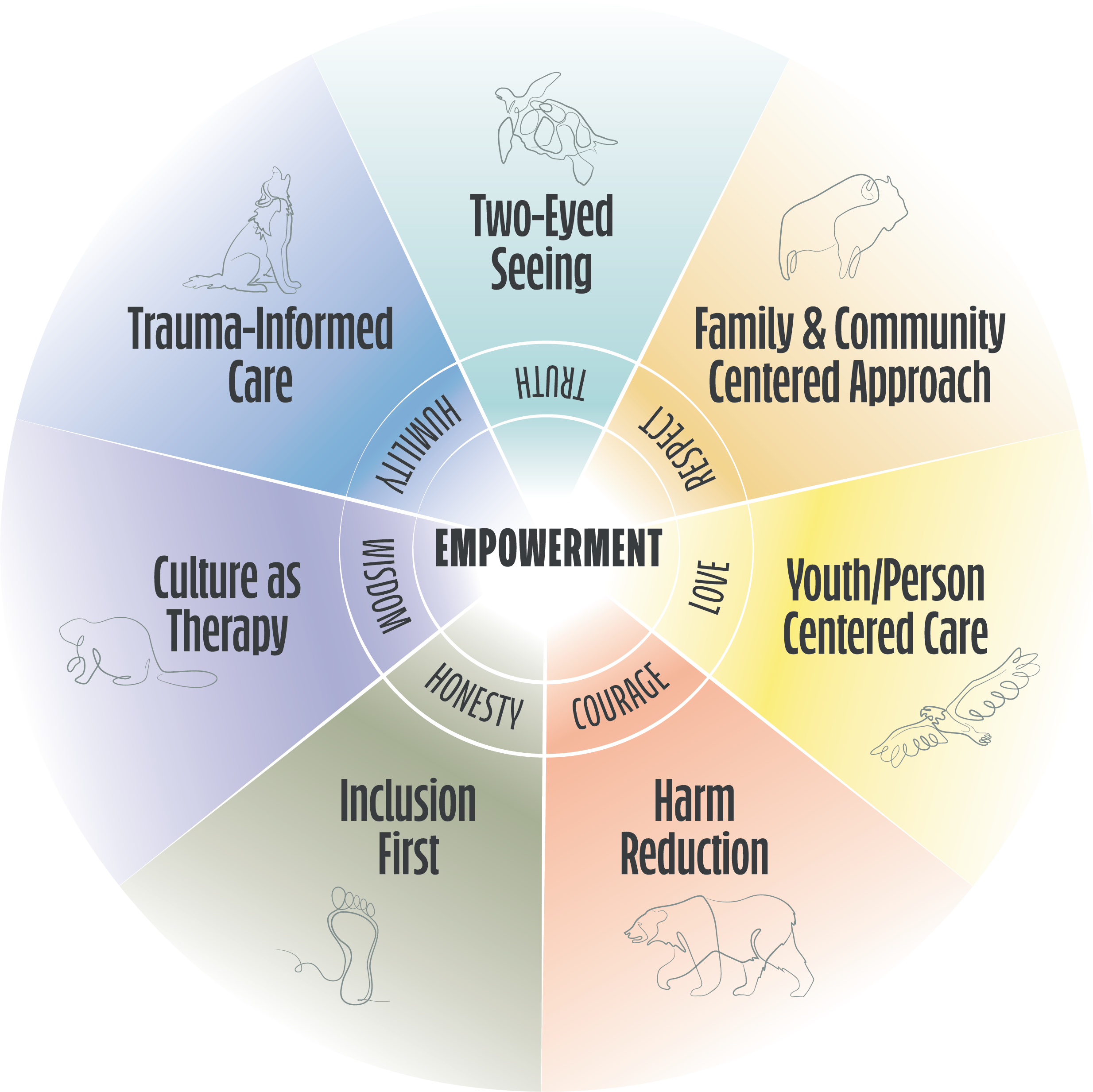 Our Seven Philosophies of Care are based on the Seven Sacred Teachings. They come from Indigenous ways of knowing and help guide how we care for and support young people.